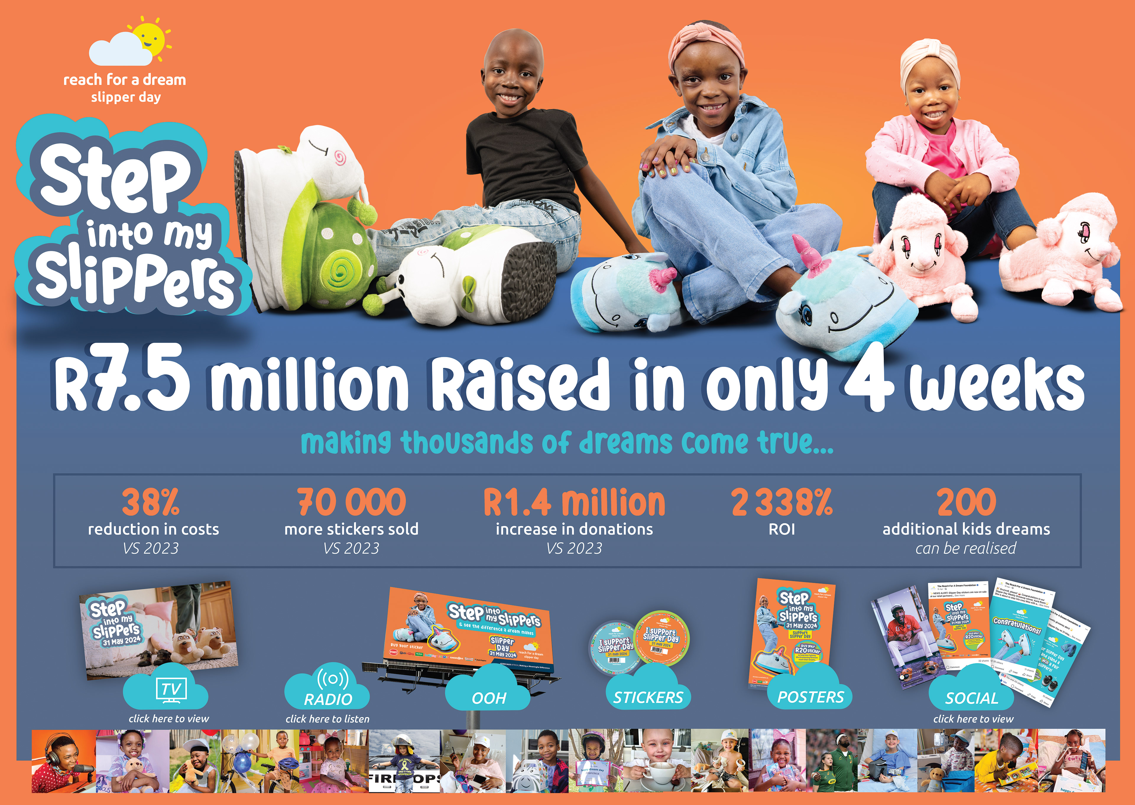R7.5 million was raised, which roughly equates to a total of 400,000 stickers sold (70,000 more than 2023) and 1000 dreams being realised (200 more than 2023). The hard costs of the campaign equated to R325,000, which means we achieved an ROI of over 2,338%!