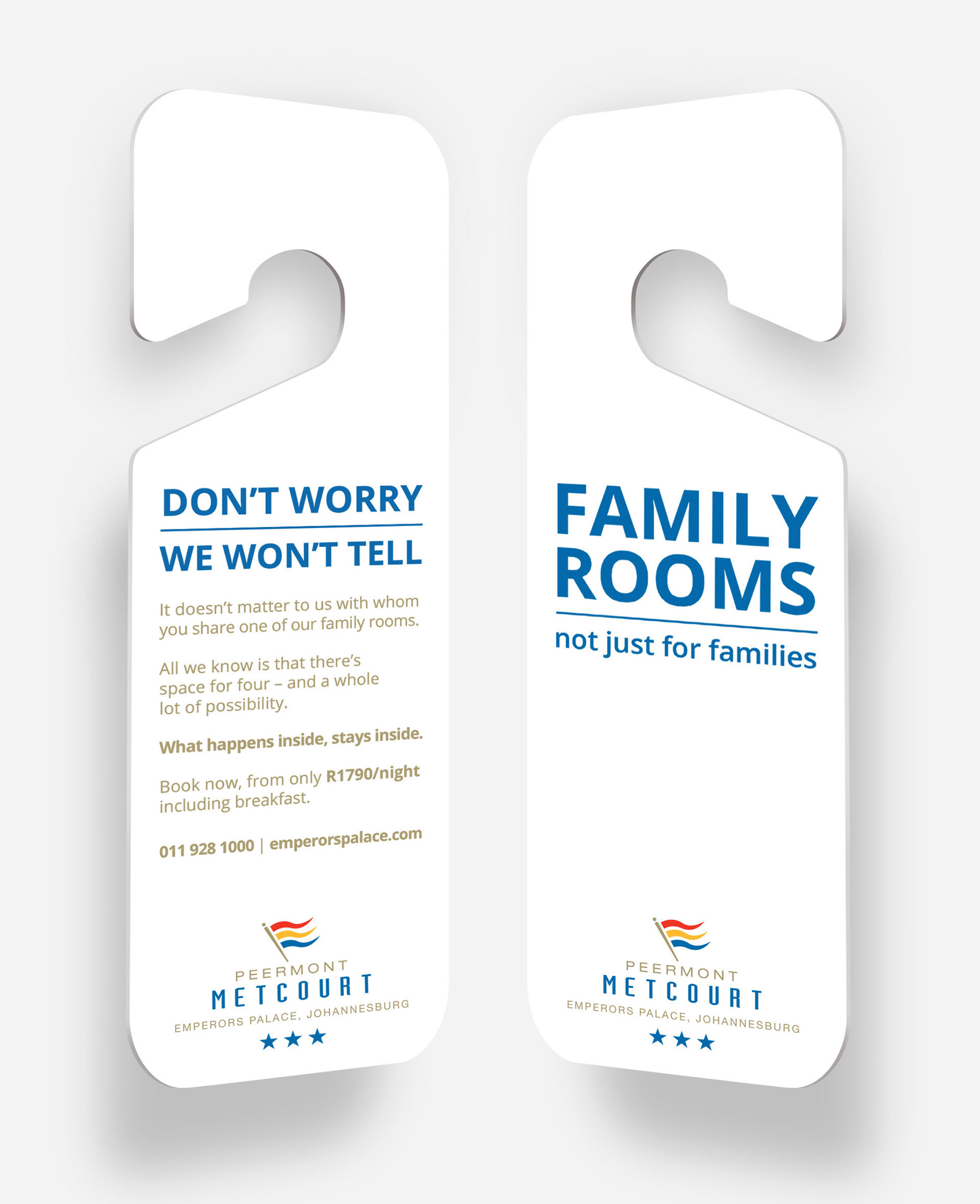 Hangers were placed on all non-family room doors within the Peermont Metcourt Hotel at Emperors Palace alongside the Housekeeping and Do Not Disturb hangers to promote the family rooms to a captive audience. They were also distributed to car rental agencies at O.R. Tambo International Airport to hang from their rental fleets’ rear-view mirrors.